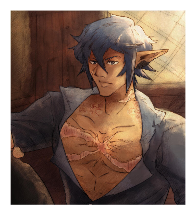 Raised in Ishgard, he's his fair share of scars, dents, burns, and bruises. He's seemingly indestructible, but it's more likely he's too stubborn to die (and obsessed with looking 'cool')